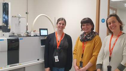 From left to right: Dr Judith Lee (Conservation Scientist), Dr Morana Novak (GREENART project scientist) and Dr Donatella Banti (contractor Conservation Scientist) standing in front of the new Pyrolysis Gas Chromatography-Mass Spectrometry (pyGCMS) instrument in our newly refurbished polymer analysis lab
