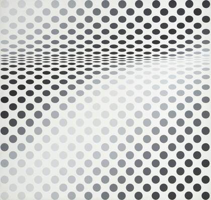 In 1964 Riley introduced variations in tone into her work, composing a series of paintings, including Hesitate, from a full palette of grey. The painting features even rows of circular and elliptical shapes. This combination of shifting tone and changing shapes gives the viewer the impression of motion in the painting, as if two horizontal abutting cylinders are receding into the painting, or as if a wave is oscillating across its surface. It is one of a group of six black and white paintings made with emulsion on a hardboard, each with titles similarly implying emotional tension including Disturbance, Chill, Loss, Where and Pause. Riley described Pause (in a conversation recorded 11 April 1986) with its vertical fold as associated with the human figure, and Hesitate in contrast as a landscape. Acquired by Tate in 1985, it is a painting that is constantly in demand for display. As with Fall, Hesitate has a similar complexity of water sensitivity and a surface of polyvinyl acetate (PVAc) vulnerable to gloss changes with established methods for cleaning.